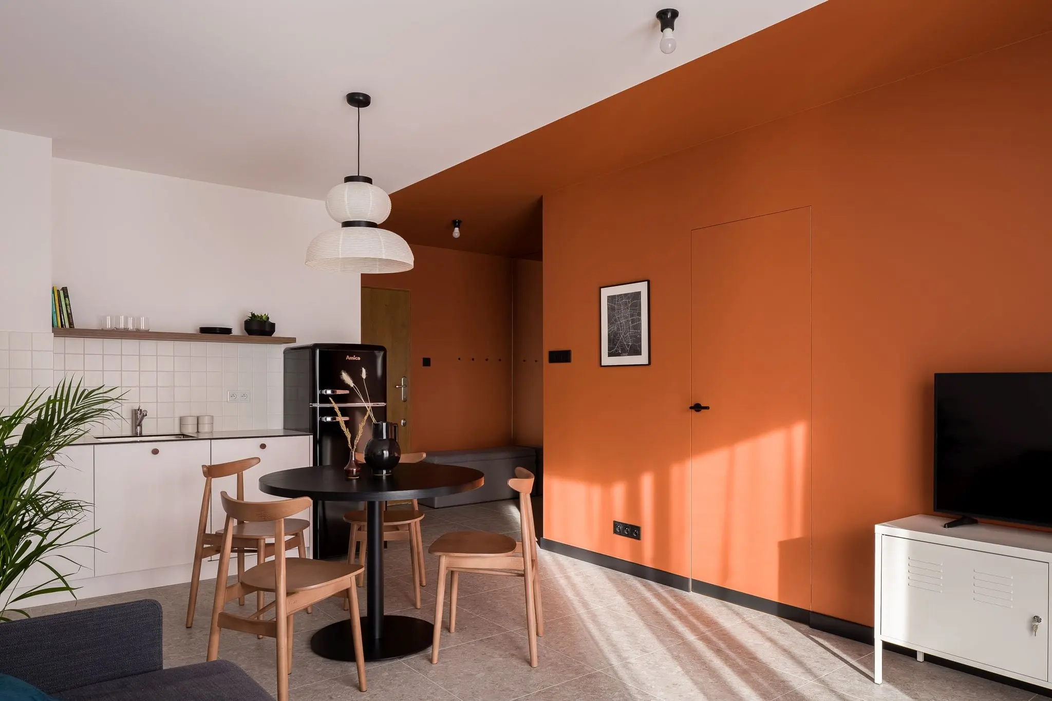 Reprezentuje potęgę słońca i siłę natury. Najchętniej wybieranym odcieniem jest, zbliżony do koloru terakoty, oscyluje on między ceglastą czerwienią, a brązem. Komponuje się doskonale z większością kolorów wnętrz i idealnie pasuje do każdego stylu, co można zobaczyć na zdjęciach poniżej w różnym stylu od minimalizmu po eklektyzm. Świetnie sprawdzi się również w projektach etno, retro, boho, a nawet industrialnych.