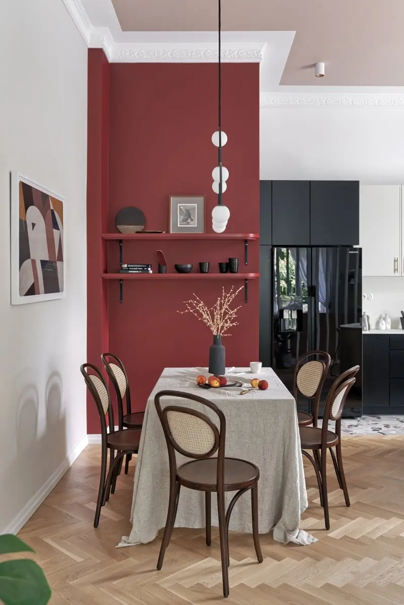 Burgund to piękny kolor, we wnętrzach pojawia się dość rzadko. Jego głębia i dominujący charakter często trudno jest uzgodnić z resztą aranżacji. Nieśmiało wkracza ten kolor do wnętrz w 2022 roku w postaci małych akcentów lub bardzo ciekawych płytek. Burgund dobrze łączy się z barwami naturalnymi, szczególnie ciemnymi gatunkami drewna, przy czym dobrze jest, jeśli będzie to drewno z dość wyraźnym, ale ciemnym rysunkiem słojów. Popularne jest jednak również łączenie go z błyszczącymi okleinami wenge w stylu lat 60 XX wieku.