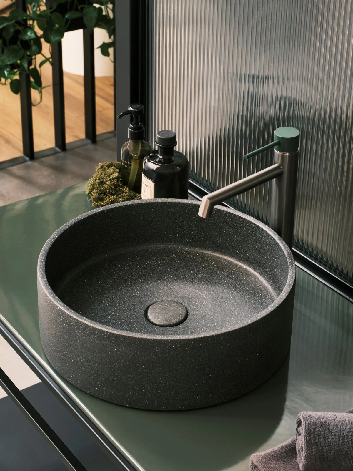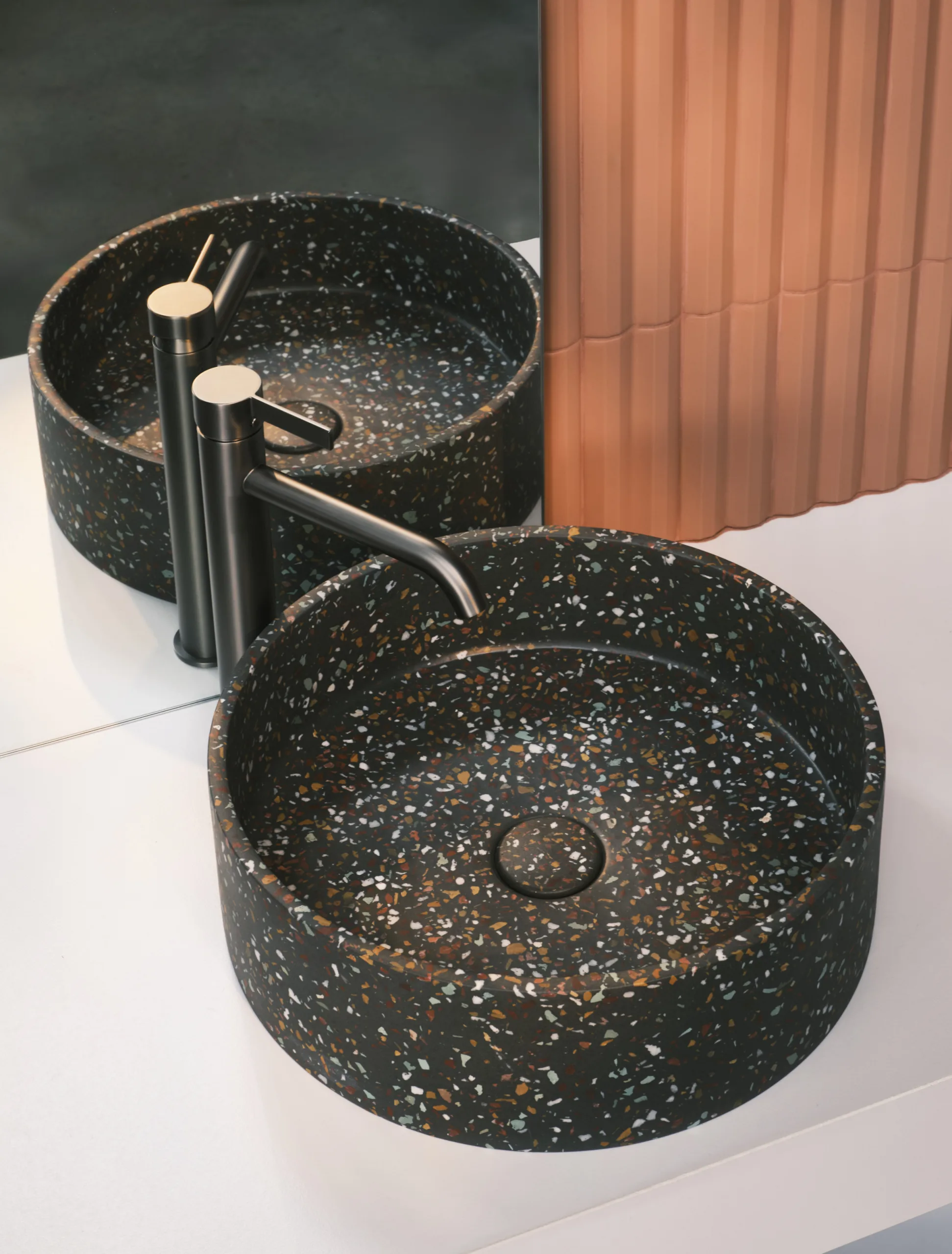 Dla tych, którzy poszukują jeszcze bardziej spersonalizowanych rozwiązań, umywalki z serii Konkrit dostępne są również w wyjątkowych wersjach kolorystycznych – klasycznej bieli, eleganckiej czerni oraz głębokiej zieleni. Każda z nich wzbogacona została o delikatny efekt latryko, subtelne wykończenie, które nadaje powierzchni lekko połyskujący, mineralny charakter, podkreślając nie tylko głębię koloru, ale również wyjątkową strukturę betonu. To właśnie te niuanse czynią z umywalek Konkrit propozycję dla najbardziej wymagających miłośników designu.