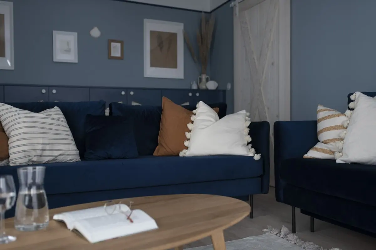 Sercem apartamentu w Międzyzdrojach jest salon z widokiem na morze. Odcienie błękitu, dominujące w projekcie, nawiązują do krajobrazu za oknem. Natomiast przemyślane ustawienie kanap, sprawia że można rozkoszować się widokiem Bałtyku o każdej porze dnia. Wnętrze stanowi mieszankę nowoczesnego spojrzenia na styl marynistyczny z elementami vintage i naturalnymi tkaninami, które ocieplają przestrzeń. Mieszkanie zaprojektowane przez arch. Angelikę Fedorczuk ma skromny metraż. Jednak jak się okazuje 40 m2 to wystarczająco dużo miejsca na zabawę stylami, fakturami, kolorami i formą. Połacie niebieskości architektka uzupełniła naturalnymi kolorami i materiałami. Warto przede wszystkim zwrócić uwagę na modne karmelowe akcenty, które idealnie łączą się z barwą charakterystyczną dla stylu marynistycznego.