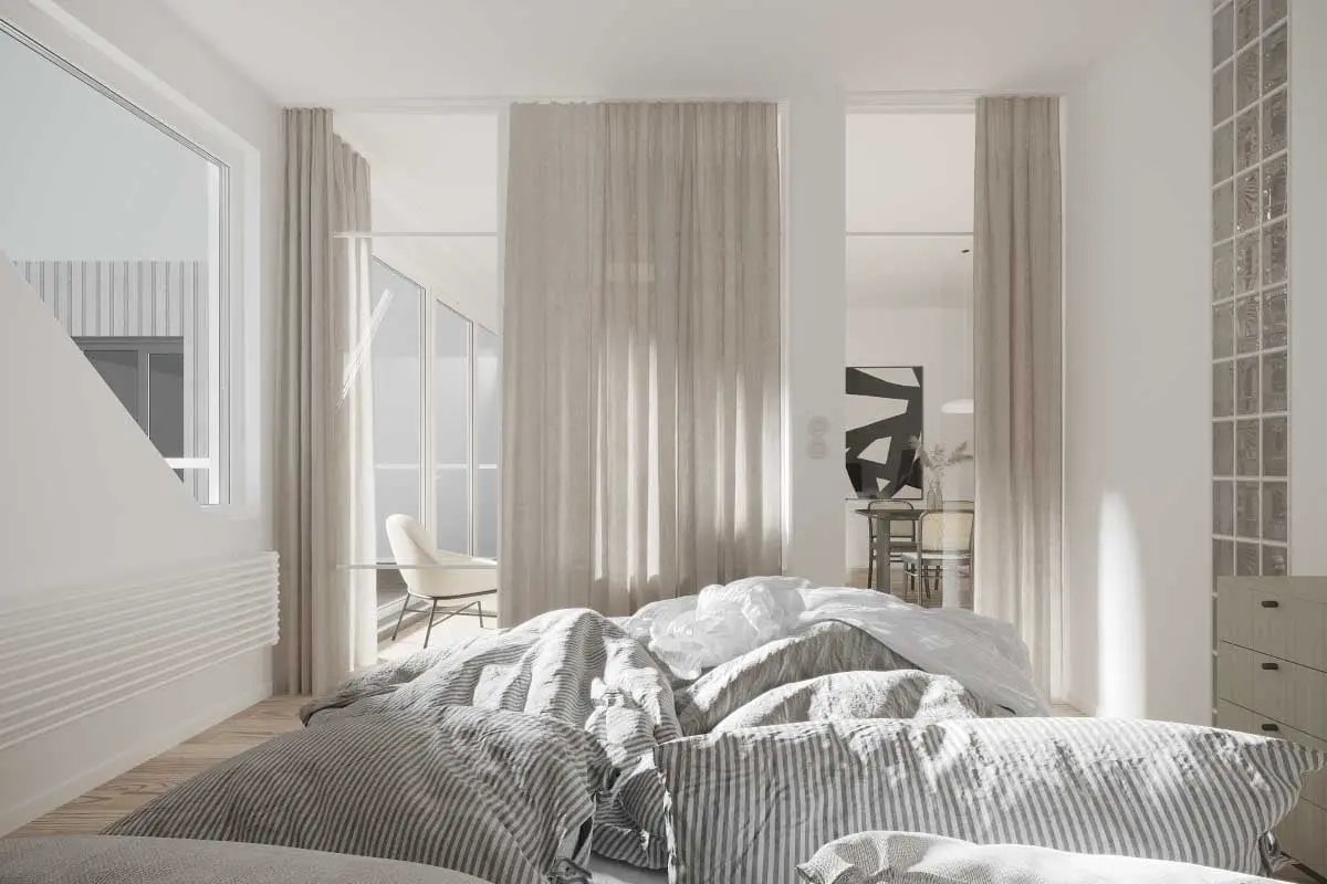 Mieszkanie o powierzchni 50m2, posiada spektakularny widok na cały Gdańsk. Architekci chcieli więc nawiązać we wnętrzu do architektury miasta, którą można podziwiać z okna. Kolorystyka opiera się na pastelowych odcieniach beżu, szarości, złamanej bieli oraz akcentu w postaci terakoty w różowo-brzoskwiniowym odcieniu. Przełamaniem subtelnej kolorystyki jest czerń, która nadaje wnętrzu charakteru. Wprowadzenie do aranżacji terakoty, zainspirowane jest dachówkami kamienic, widocznymi z okien mieszkania. Wyspa kuchenna na planie elipsy ze żłobionymi frontami, nawiązuje do gdańskiego modernizmu. Natomiast kultowe krzesła Fameg o wyplatanych siedziskach i oparciach, przywodzą na myśl klimat nadmorskich kawiarni.