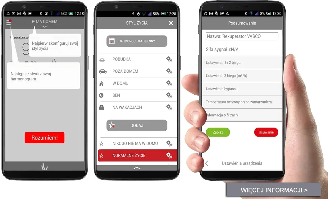 Nieodzowną zaletą czujnika dwutlenku węgla, a także czujnika wilgotności jest zdolność dostosowania intensywności wentylacji do aktywności mieszkańców. Dzięki temu użytkownicy nie muszą kontrolować pracy rekuperatora i zmieniać biegów jego pracy. Dla tych, którzy jednak lubią mieć wszystko pod kontrolą VASCO Group opracowało specjalną aplikację na smartfona VASCO COMFORT CONTROL. Dzięki niej użytkownik może tworzyć własne programy tygodniowe, wykorzystując wszystkie opcje pracy rekuperatora i zapisywać autorskie nazwy programów. Dzięki harmonogramom tygodniowym można ustawić tryb A-automatyczny dla dowolnego okresu. Jego aktywacja sprawi, że rekuperator będzie sterowany przez czujnik poziomu zawartości CO2 w salonie i/lub czujnik wilgotności w łazience. Jest to bardzo praktyczne rozwiązanie szczególnie w domach, w których liczba przebywających osób nieustannie się zmienia.