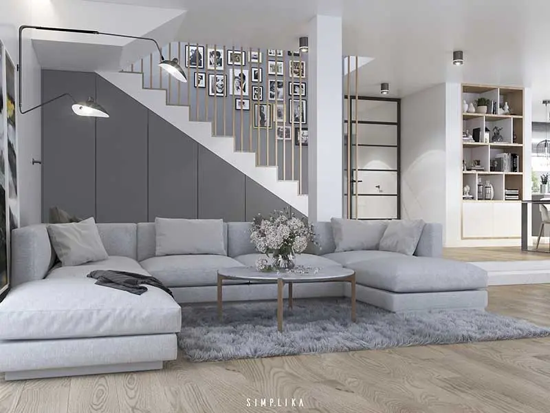 Zabudowy stolarskie do sufitu, czy zagospodarowanie przestrzeni pod schodami to jedne z licznych zabiegów, które projektanci z pracowni Simplika zastosowali poszukując miejsca do przechowywania przedmiotów domowników.