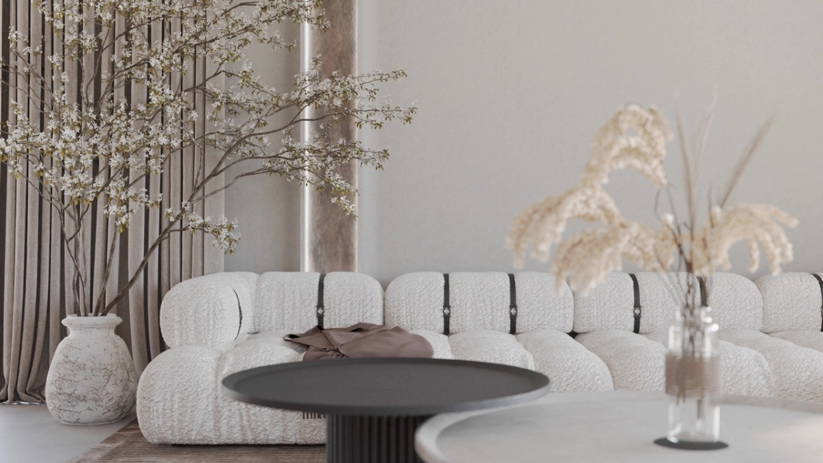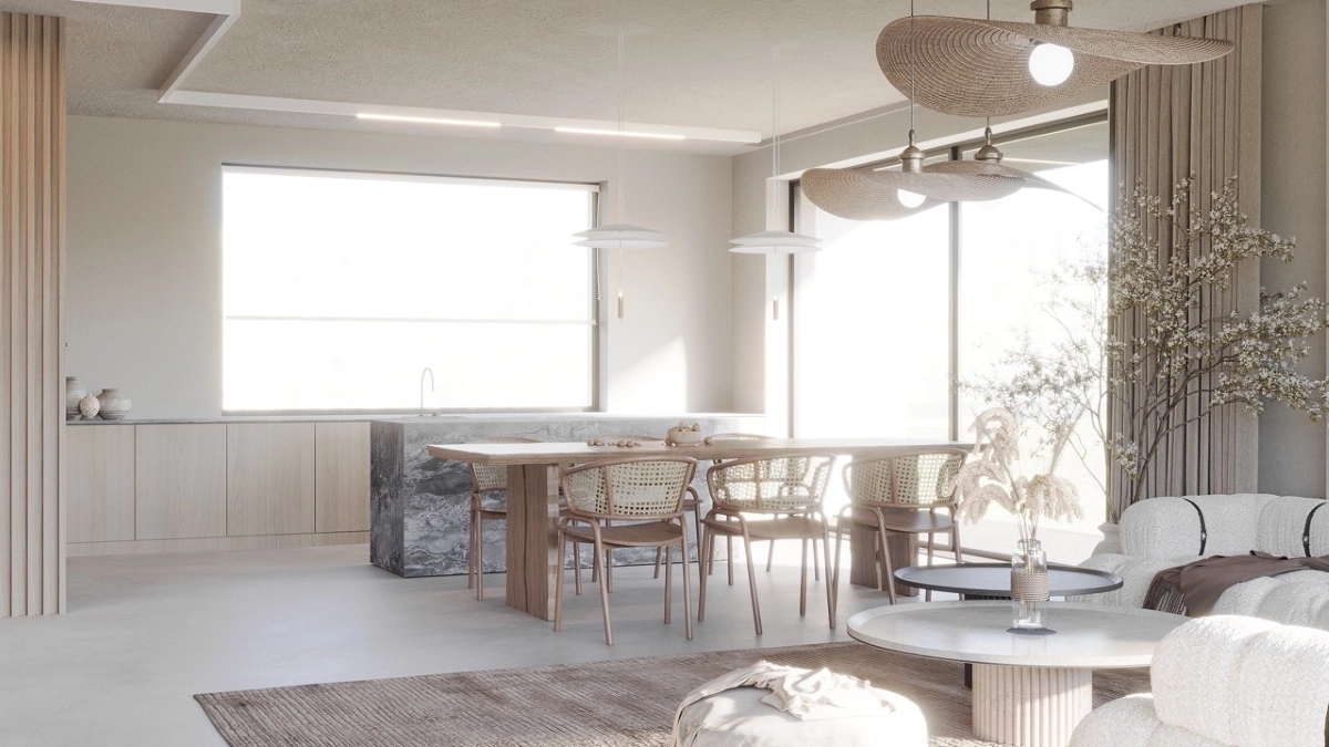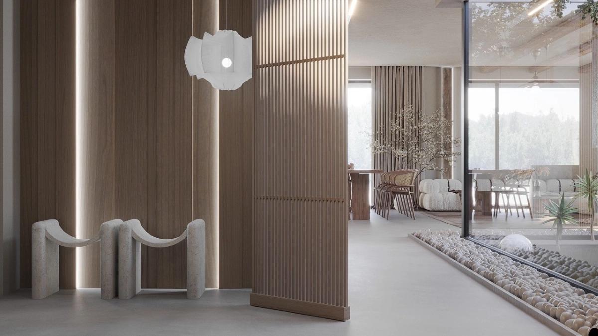 W projekcie Interiorsy szczególną uwagę zwrócono na naturalne materiały i formy inspirowane naturą. Lniane tkaniny, jasne kolory, naturalne drewno, i kamień tworzą spójne tło dla mebli o obłych, nieregularnych kształtach. Duże przeszklenia wnoszą światło naturalne do wnętrza, a okna otwierają przestrzeń na otaczającą przyrodę. Takie podejście podkreśla pierwszoplanową rolę natury, wprowadzając atmosferę sprzyjającą wypoczynkowi.