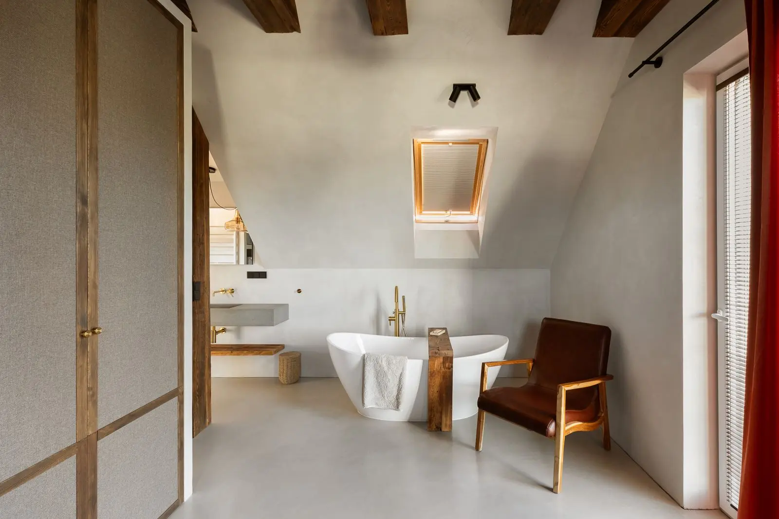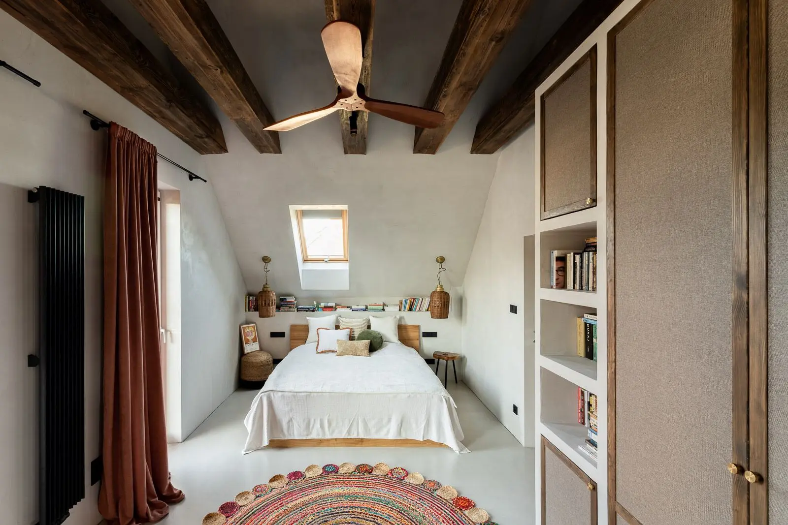 Sypialnia, jako oaza regeneracji i nabierania sił, została stworzona z myślą o komforcie i spokoju. Właściciele domu zapragnęli połączyć w jednej przestrzeni sypialnię, garderobę oraz łazienkę. Podniesiony sufit pozwolił odsłonić elementy konstrukcji dachu i wyeksponowanie starego drewna, które jest obecne w całym domu. Przechodnia garderoba stanowi doskonałe rozwiązanie, łącząc sypialnię z łazienką, zapewniając jednocześnie funkcjonalność i estetykę. Wentylator z drewnianym wykończeniem dodaje charakteru, tworząc atmosferę sprzyjającą wyciszeniu i relaksowi.