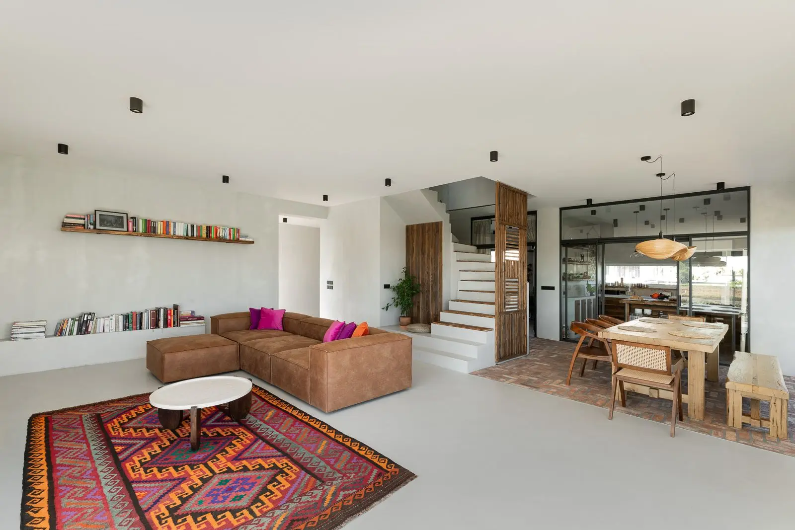 Wyjątkową częścią domu są specjalnie zaprojektowane schody, nazwane przez mieszkańców „rzeźbą”. Znajduje się ona w centralnym punkcie domu, która pełni nie tylko funkcje praktyczną. Jej unikalny kształt pozwala na swobodny przepływ energii, tworząc wrażenie ciągłego ruchu i zmiany. Ręcznie wykonane stopnice o obłym kształcie nadają charakteru i elegancji, a parawan ze starego drewna dodaje orientalnego uroku.