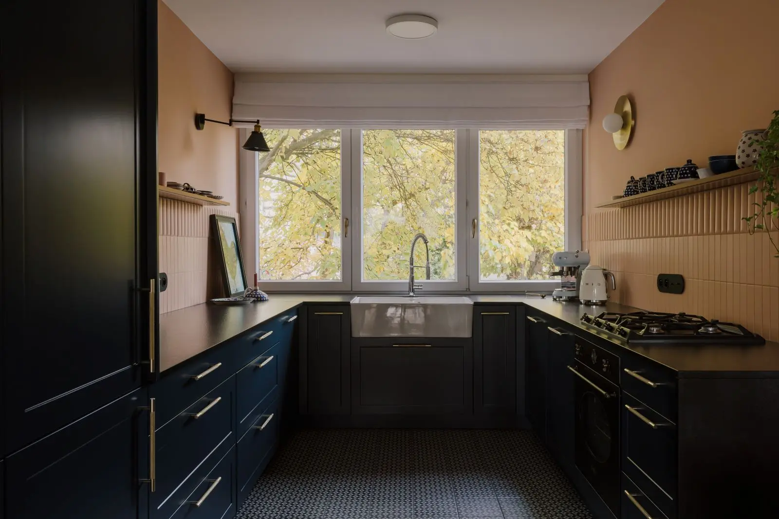 Jednak to połączenie z pomarańczowymi płytkami 41zero42 czyni tę kuchnię niezwykle wyjątkową. Płytki te, o ciepłym, intensywnym odcieniu pomarańczu, doskonale komponują się z granatem, tworząc efektowną grę kontrastów. Ich matowa faktura dodaje wnętrzu przytulności, jednocześnie nadając mu nowoczesnego charakteru.