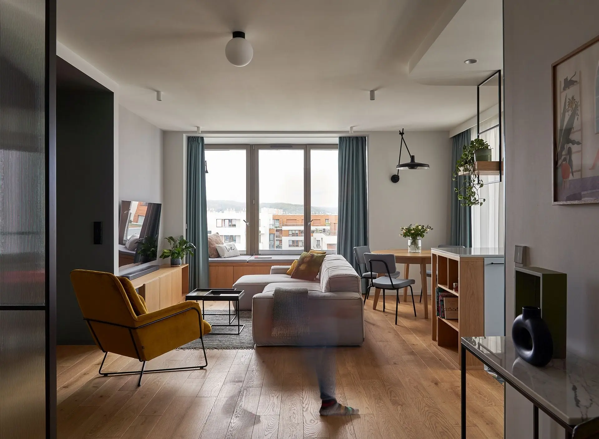 Na przyjazny charakter strefy dziennej wpływają miękkie meble na czele z bardzo wygodną sofą UMO polskiej marki NOBONOBO oraz fotelem w kolorze ochry. Autorzy projektu zdawali sobie sprawę, że modułowa sofa, na której można leniuchować godzinami, przypadnie do gustu domownikom. Cechą charakterystyczną mebla jest naturalnie pomięta i pomarszczona tkanina oraz odwrotne szycie, które nadaje mu charakteru. To miejsce podkreśla dodatkowo duże siedzisko we wnęce okiennej. To zarazem okno na świat jak i domknięcie strefy salonowej. Warto zauważyć, że zasłony mogą zamknąć tę wnękę i dzięki temu można ukryć się z książką i pięknym widokiem. To taka strefa chillu, choć nie jest to osobne pomieszczenie.