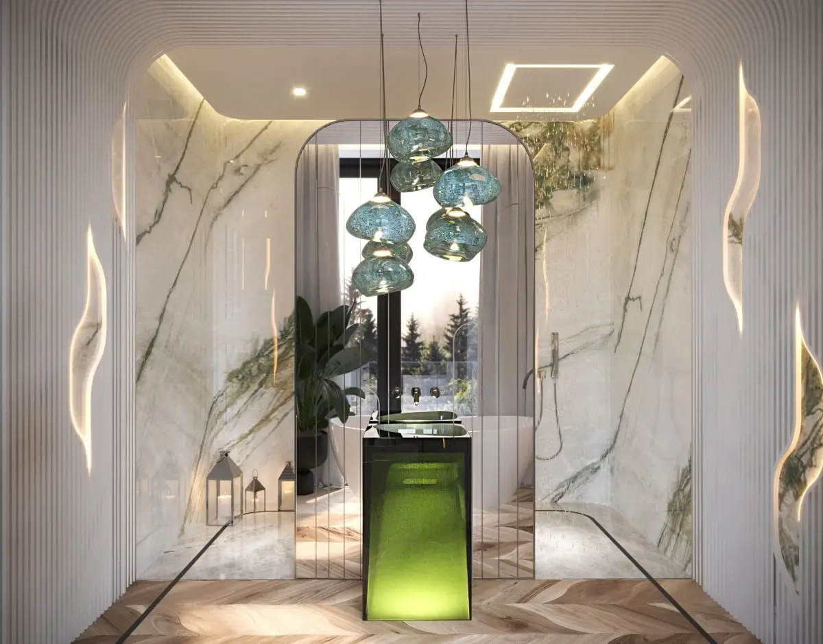 Wykorzystując inspiracje Bauhausem, architektki wprowadziły do wnętrza Domu Hampton Residence nowoczesne elementy. Duże, czyste powierzchnie stworzyły przestrzenie, w których detale, takie jak efektownie podświetlona umywalka czy designerskie meble, stanowią główne punkty aranżacyjne. Charakterystyczne dla Bauhausu gięte rury z chromowanej stali oraz minimalistyczne formy mebli doskonale komponują się z inspiracją stylem Hampton.