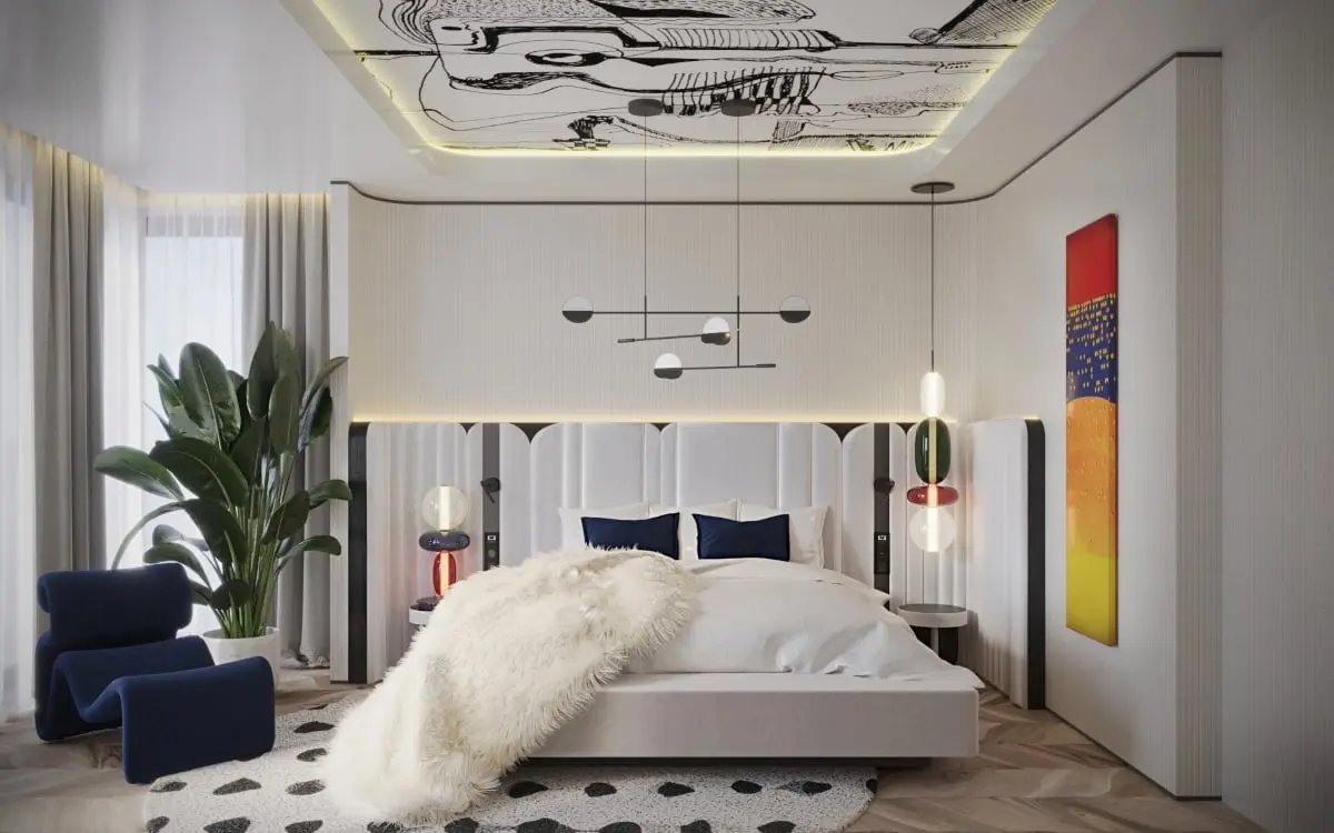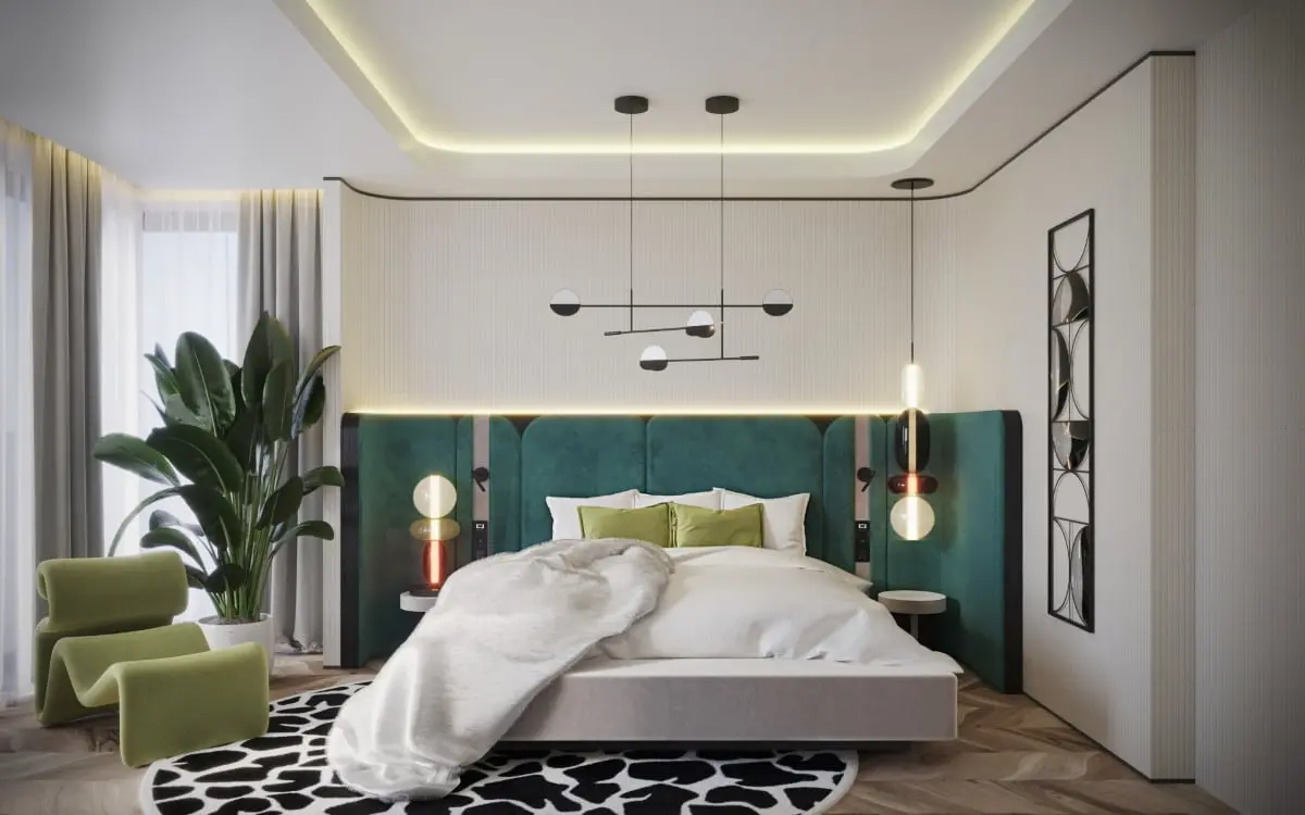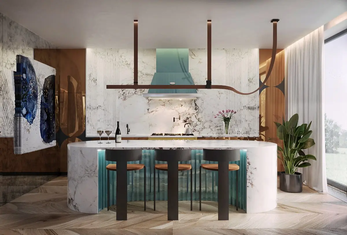 W otwartej strefie dziennej dominują duże przestrzenie eksponujące designerskie meble i oświetlenie. Formy zgeometryzowane, obłe kształty, oraz nasycone kolory wnoszą do wnętrza energię i unikalny charakter. Kombinacja granatów, turkusów i żółcieni, z szkłem zdobionym ornamentami Bauhausu, tworzą przestrzeń pełną kontrastów i harmonii.