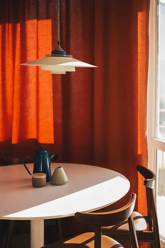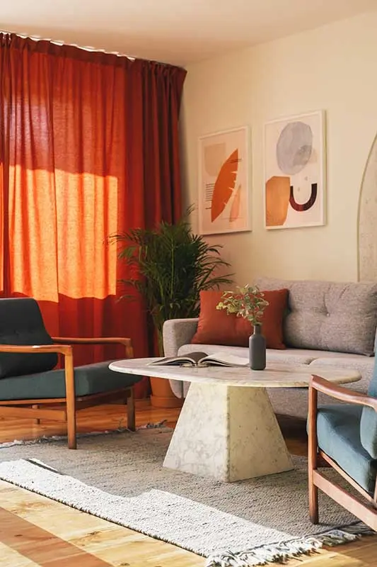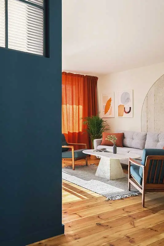 Zestaw kolorystyczny, który dominuje w aranżacji wnętrza, to głęboki błękit oraz rudy. Duet został wytypowany przez instytut Pantone do kolorów sezonu letniego 2019, a w tym przypadku idealnie dopełnia klimat retro. Para błękit – pomarańcz, przedstawiona jest w bardzo różnych odcieniach i nasyceniach, a towarzyszy jej szarość, która również ma wiele twarzy. Kolory wykorzystane w realizacji mieszkania w Sopocie, nie tylko mają za zadanie współtworzyć stylistykę vintage, ale i nadają wnętrzu przytulności, luzu i atmosfery odprężenia, która ma towarzyszyć przebywającym tu lokatorom.