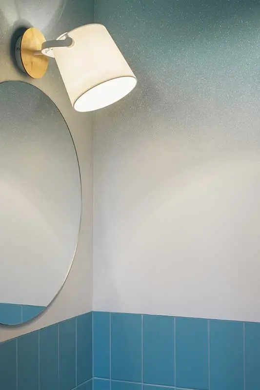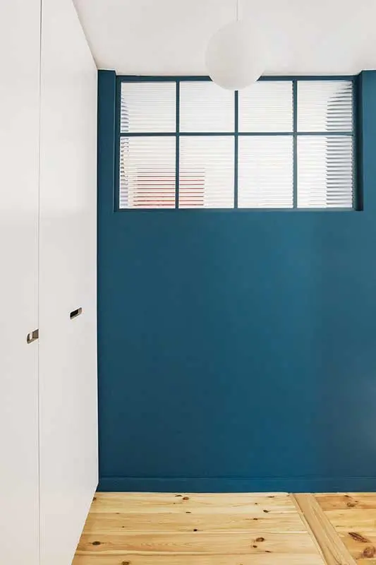 Kolejnym nawiązaniem do stylu lat 80-tych jest świetlik w ściance, pomiędzy kuchnią, a holem. Nawet materiał, występujący w roli szyby, przypomina o rodowodzie mieszkania. Pokrycie ściany błękitnym kolorem jest zapowiedzią połączeń barwnych, które spotkamy w części dziennej.
