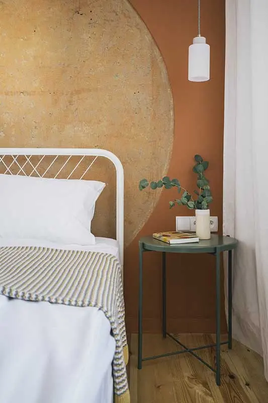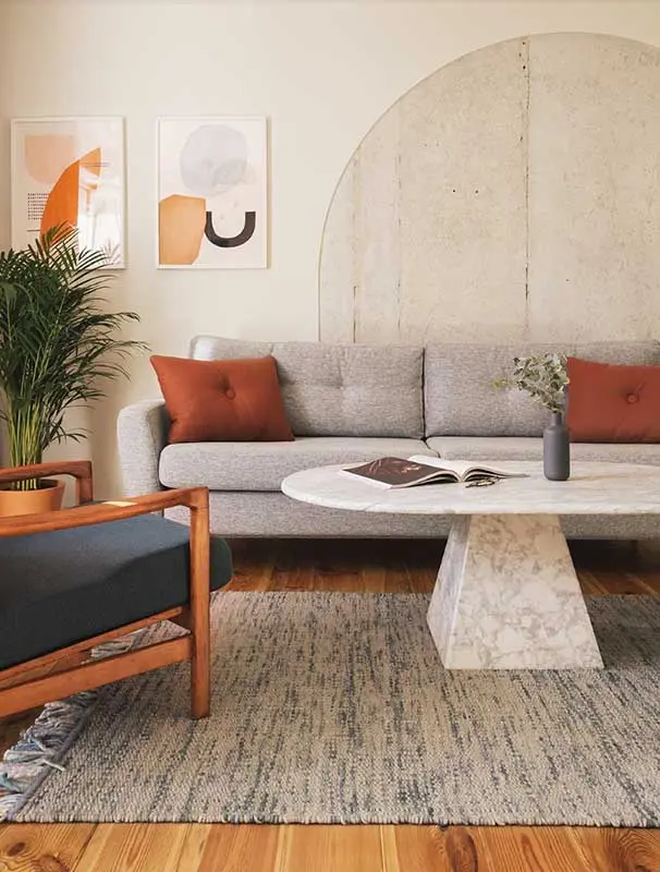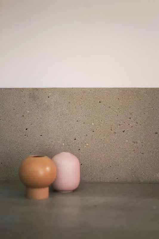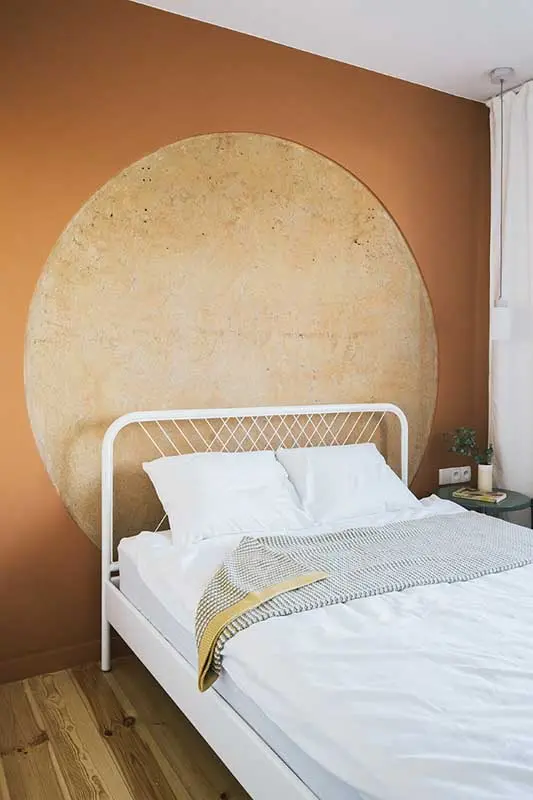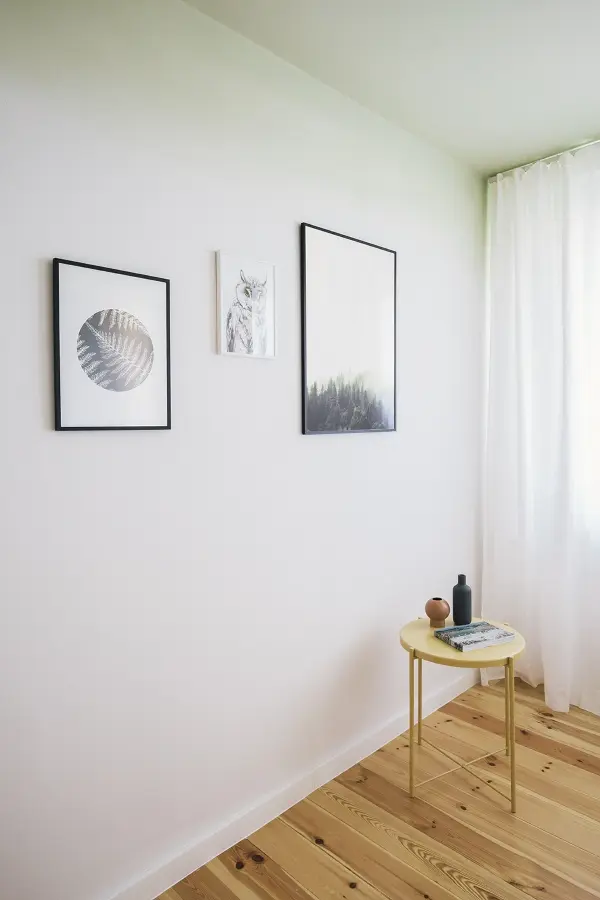 Styl mieszkania w Sopocie jest silnie związany z klimatem vintage. Podkreśla to łagodny romans starego z nowym, gdzie trudno znaleźć różnice między jednym, a drugim. Architekci dobrali wszystkie elementy wyposażenia tak, by były bardzo spójne, mimo, że cześć z nich to autentyki z lat 60-tych i 80-tych, a cześć jest zupełnie nowa. Zabieg, który zasługuję na szczególną uwagę, to wyeksponowanie fragmentów surowej, żelbetonowej ściany, która tworzy oryginalny mural. W salonie odnajdziemy wzór, przywodzący na myśl zamurowany portal, natomiast w sypialni okrąg, pokryty złotą farbą. Dzięki porowatej powierzchni tynku, uzyskany został obraz księżyca, idealnie wpisujący się w przeznaczenie pomieszczenia.