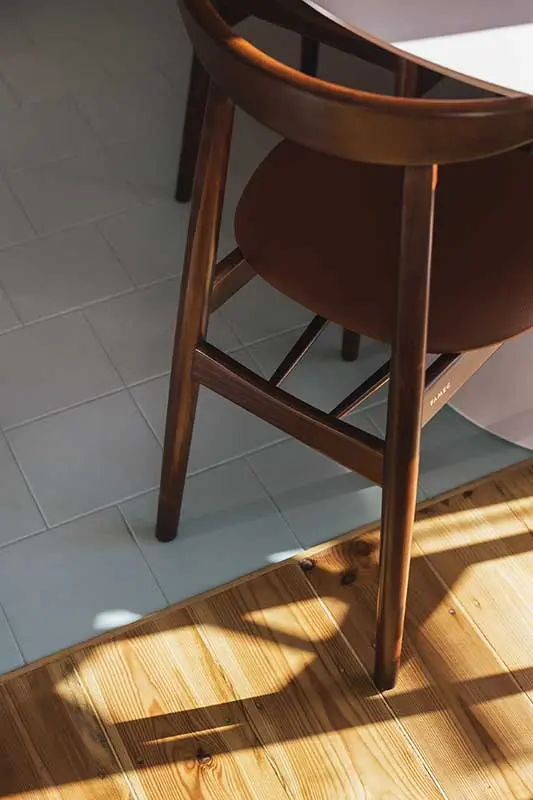 Krzesła marki Fameg, dostępne są w wielu emaliach i wybarwieniach, a także szerokiej gamie tapicerek, dzięki czemu meble można personalizować, dopasowując je do projektu wnętrza. Architekci ze studia PB, zdecydowali się na ciemny odcień emalii, imitujący drewno orzechowe oraz obicie siedziska w karmelowym kolorze. Takie połączenie nadało krzesłu charakteru vintage.