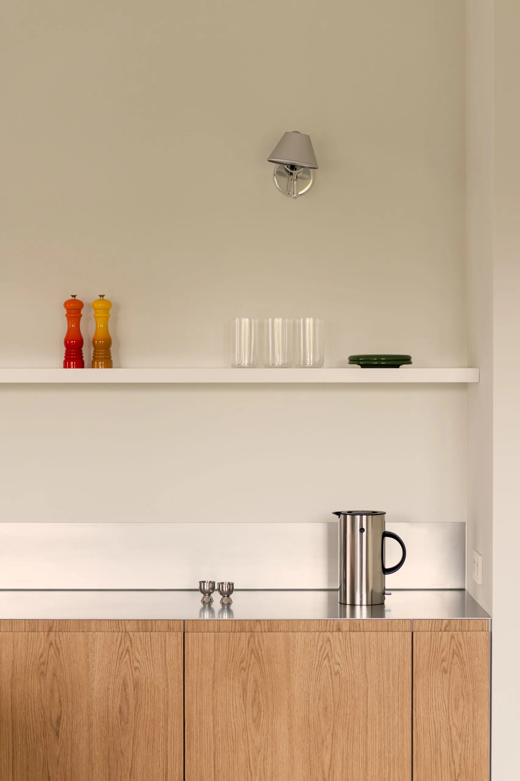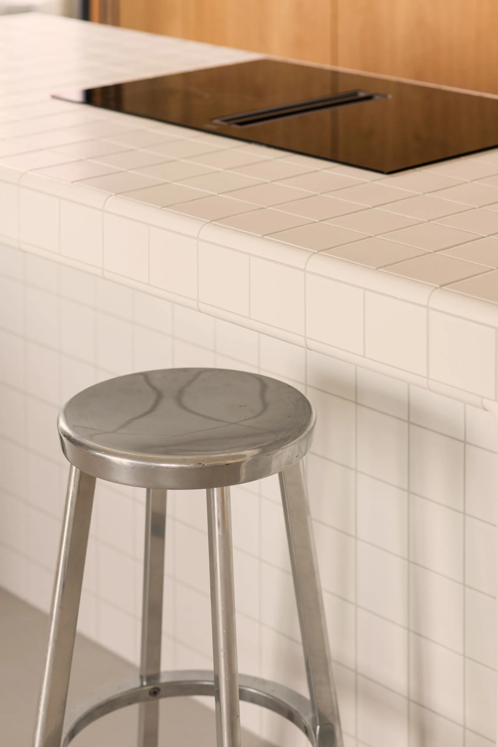 Kuchnia? W roli głównej stalowy blat, duńska lampa Gejst i wyspa kuchenna jak rzeźba – pokryta 10×10-centymetrowymi płytkami, które bardziej przypominają architekturę niż zabudowę. To detal, który przyciąga wzrok, ale nie dominuje.