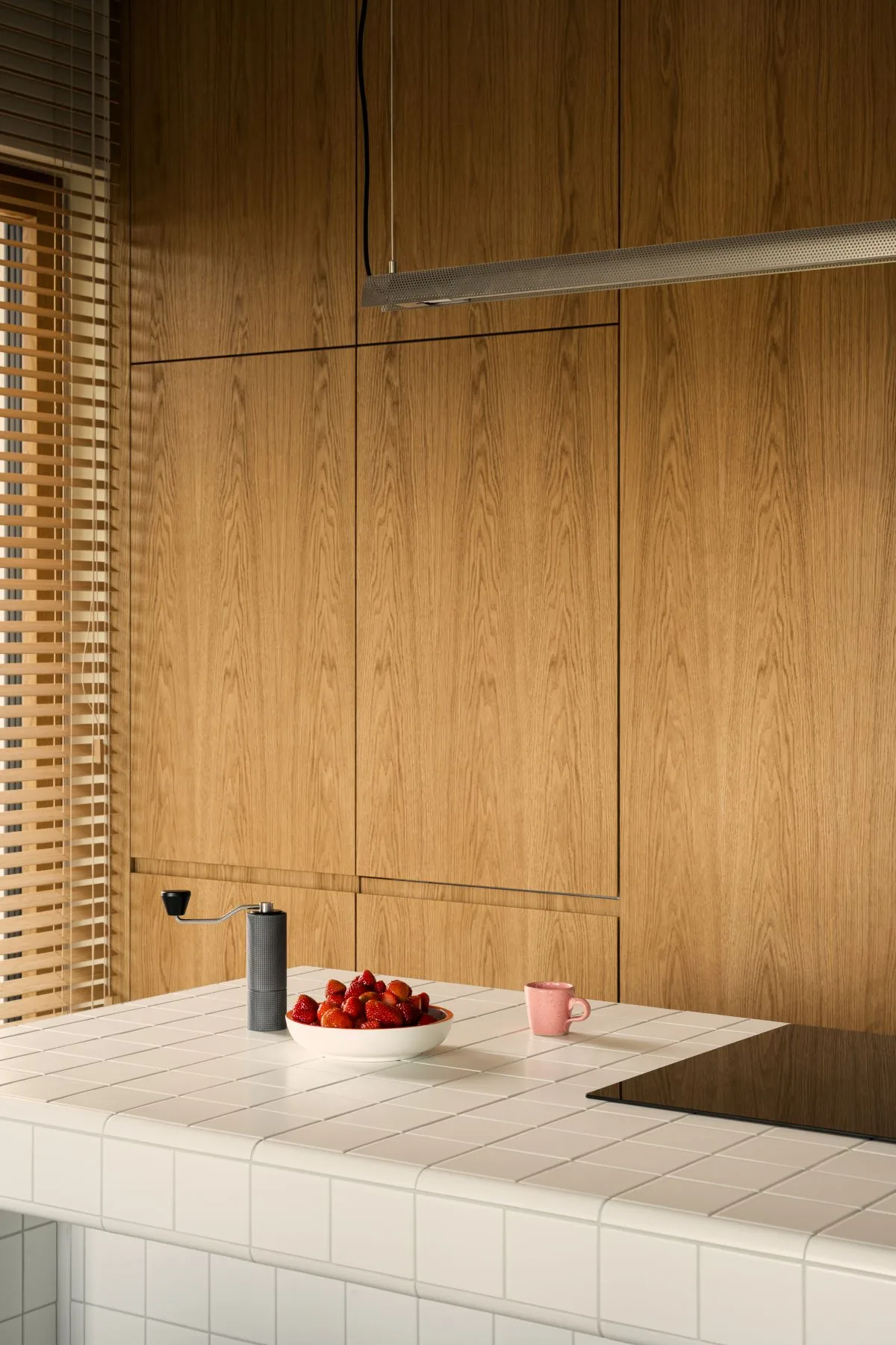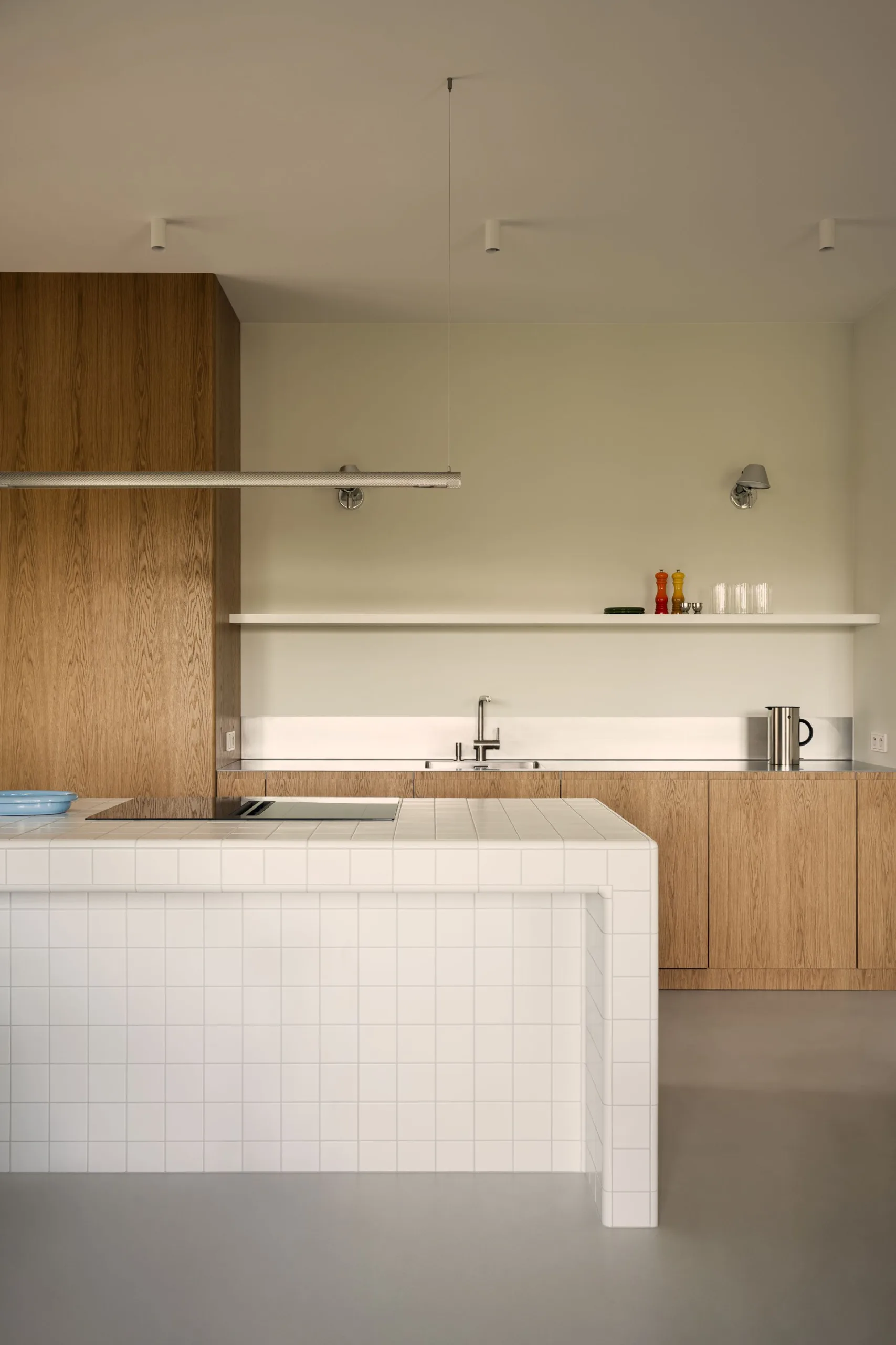 Kuchnia? W roli głównej stalowy blat, duńska lampa Gejst i wyspa kuchenna jak rzeźba – pokryta 10×10-centymetrowymi płytkami, które bardziej przypominają architekturę niż zabudowę. To detal, który przyciąga wzrok, ale nie dominuje.