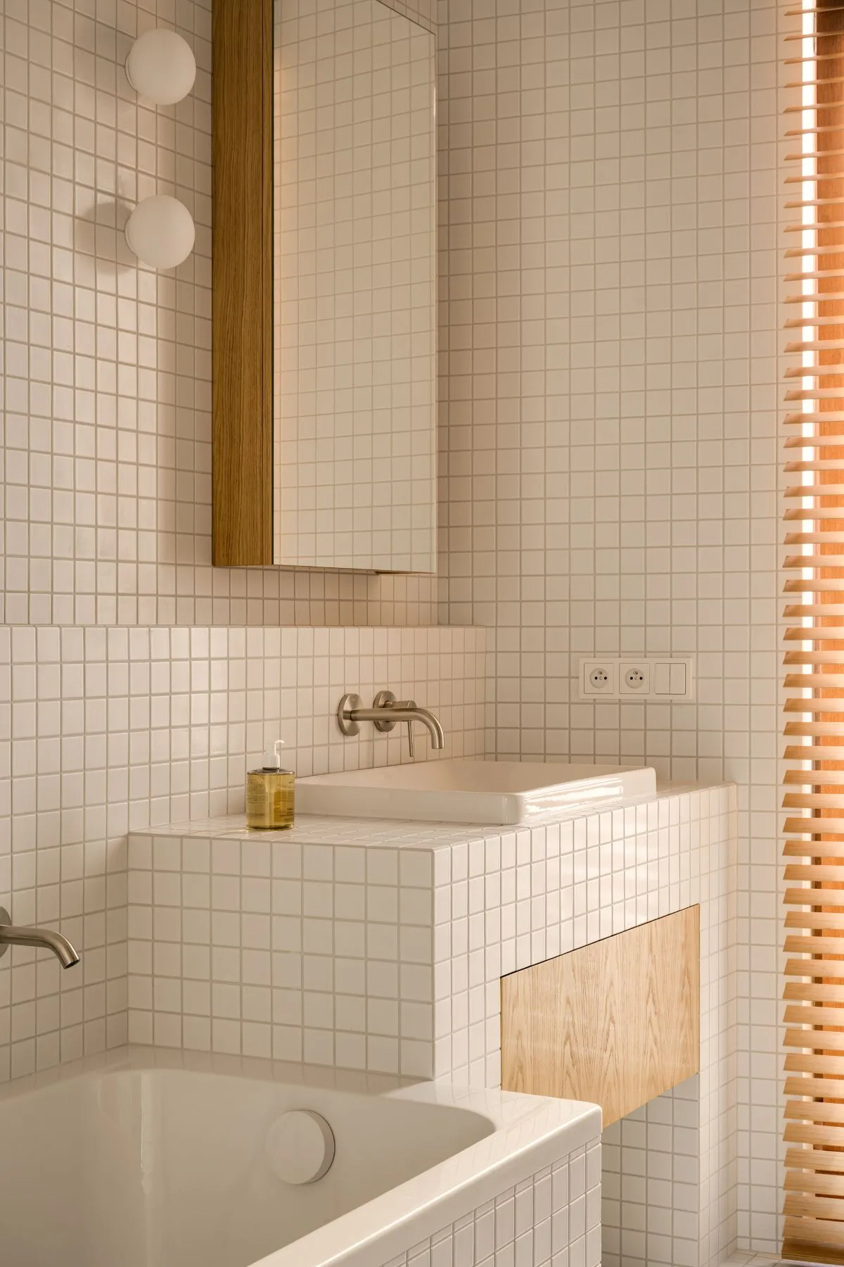 Łazienka? Biała mozaika oplata wszystko – od podłogi po obudowę wanny. Tworzy rytm, który koi. I znów kontrapunkt: dębowa szafka, bambusowe rolety, dwie kuliste lampy Artemide. Geometria w służbie spokoju.