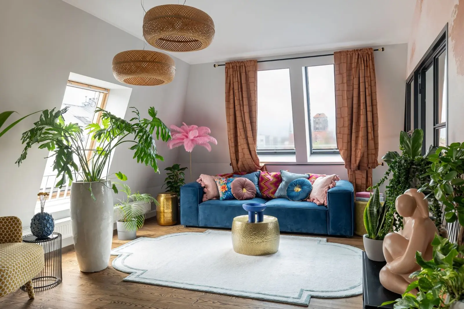 Paleta kolorów zachowana w mieszkaniu bazuje na meblach, które już w nim się znajdowały. A była to niebieska kanapa, złoto-czarna vintage szafka chinoiserie, żółty fotel i nuta pomarańczy ceglanych elewacji starego miasta. To połączenie kolorów tworzy żywą i wciągającą atmosferę.
