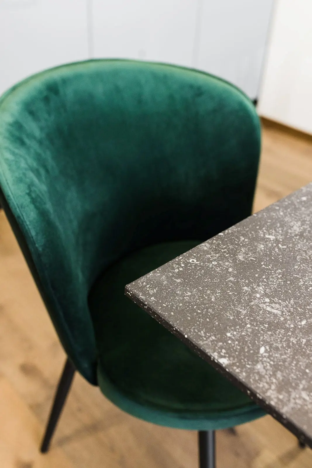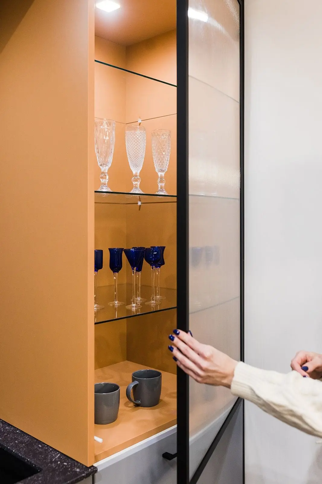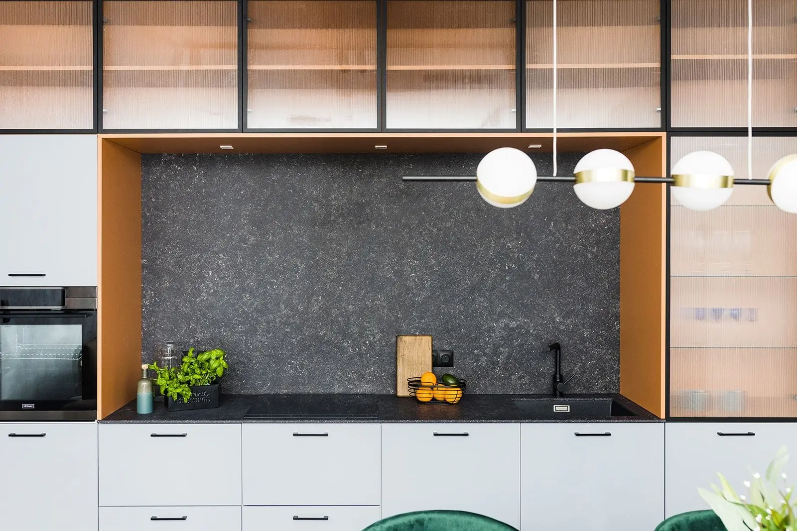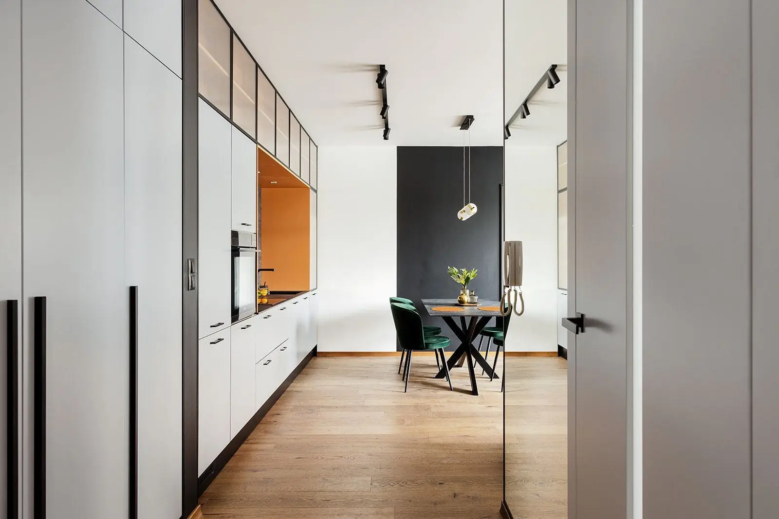 Dodatkowo, aby dodać życia i energii do wnętrza, zdecydowano się na użycie akcentów kolorystycznych w postaci zieleni i pomarańczowego. Te jasne, intensywne barwy dodają wnętrzu charakteru, jednocześnie nie przytłaczając minimalistycznego designu.