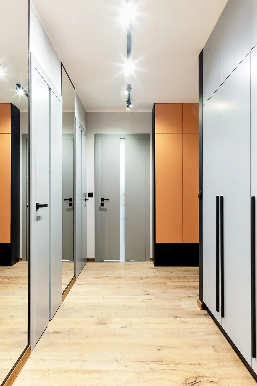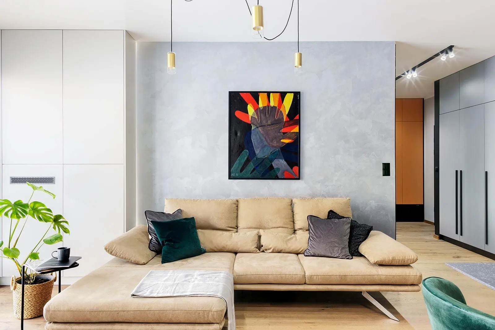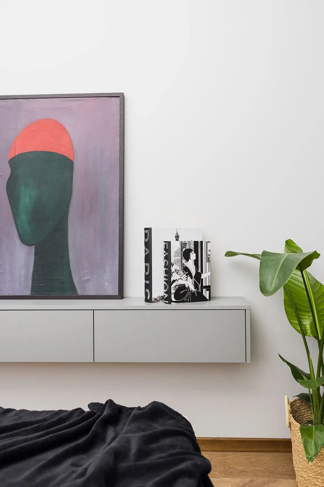 Czy udało się osiągnąć zamierzone cele? Tak, wnętrze spełnia założenia architekta, tworząc harmonijną i funkcjonalną przestrzeń. Szarość ścian stanowi neutralne tło, na którym wyraźnie eksponują się akcenty. Te barwy dodają wnętrzu energii, a jednocześnie nie przerywają spójności minimalistycznego designu. Duża ilość szaf i ukrytych przestrzeni pozwala utrzymać porządek. Obrazy i tynki na ścianach dodają wnętrzu charakteru, sprawiając, że każde pomieszczenie wydaje się być unikalne.