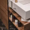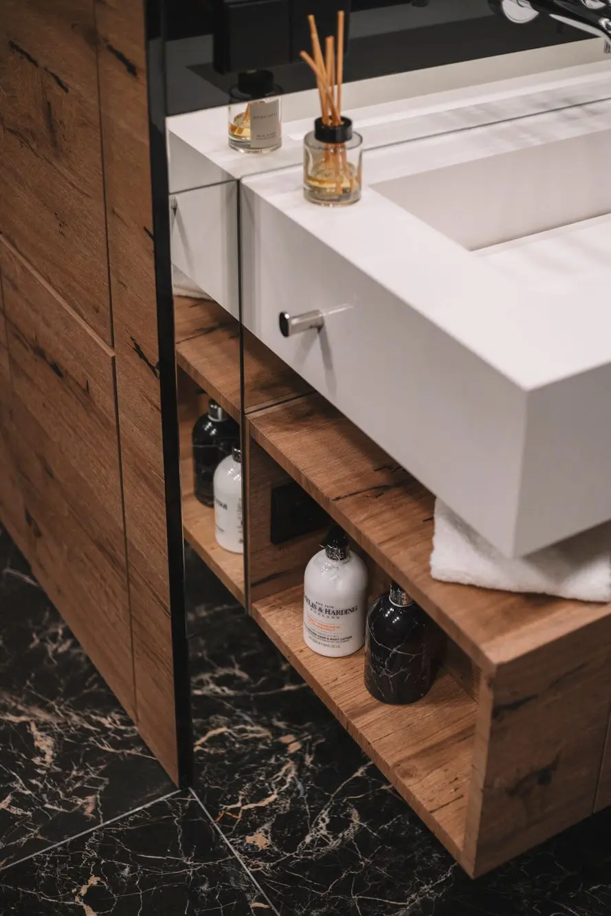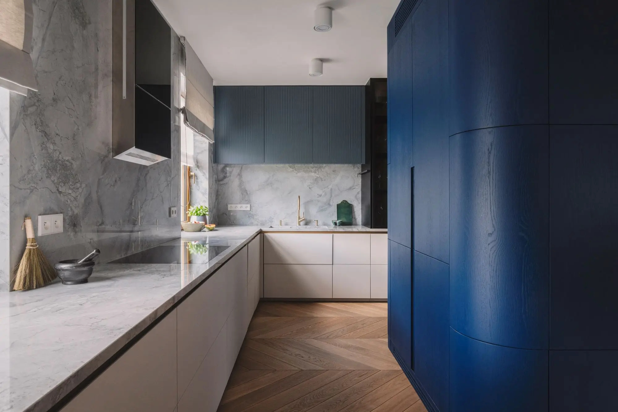 Centralnie umieszczony, wielofunkcyjny trzon pełni rolę łącznika między różnymi funkcjami mieszkania. Zewnętrzna struktura trzonu została podzielona na strefy, które odpowiadają różnym częściom mieszkania. Od strony holu wejściowego, trzon zawiera eleganckie siedzisko, natomiast od strony jadalni znajdują się praktyczne półki. Kuchnia jest wyposażona w lodówki, lodówki na wino, wbudowany ekspres do kawy oraz funkcjonalne szafki do przechowywania. Wewnątrz trzonu znalazły miejsce także szafy gospodarcze i funkcjonalna garderoba.